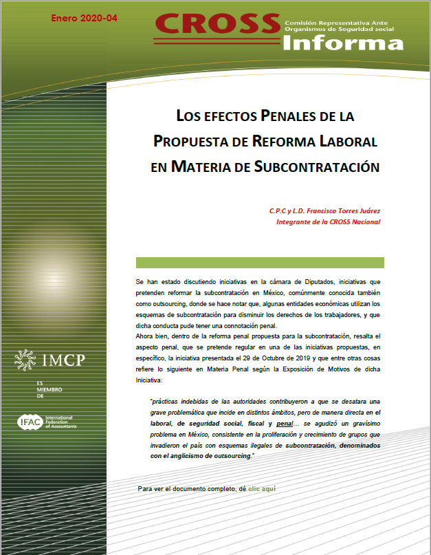 Ahora bien, dentro de la reforma penal propuesta para la subcontratación, resalta el aspecto penal, que se pretende regular en una de las iniciativas propuestas, en específico, la iniciativa presentada el 29 de Octubre de 2019 y que entre otras cosas refiere lo siguiente en Materia Penal según la Exposición de Motivos de dicha Iniciativa: