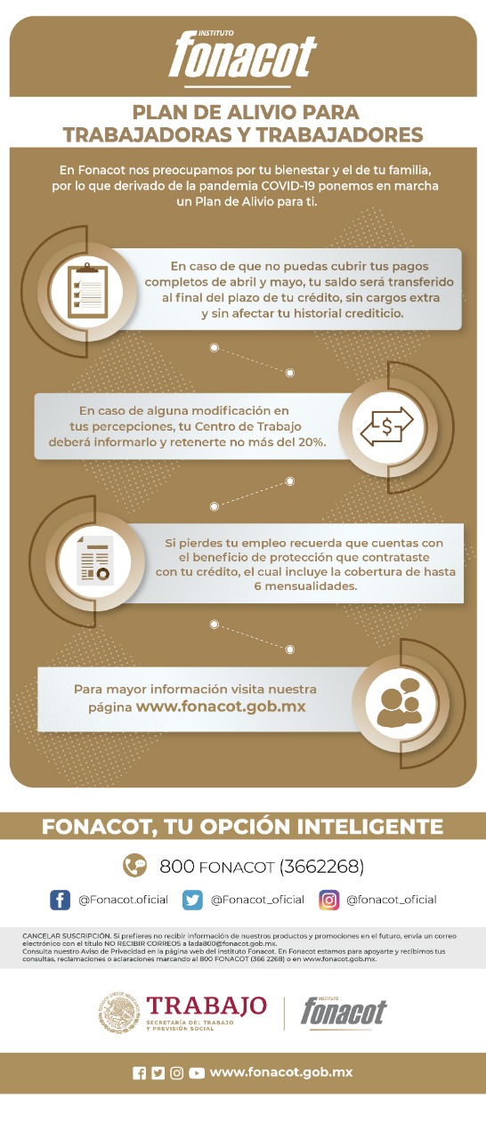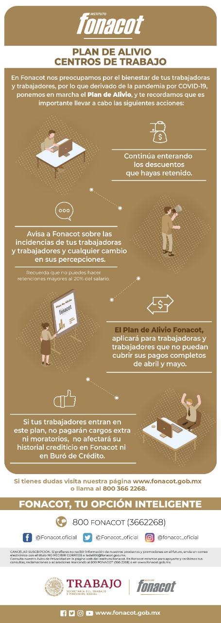 1. Este Plan de Alivio sólo aplica para pagos de nómina de los meses de Abril y Mayo del presente año, por lo que debemos estar atentos en caso de continuar la Pandemia del COVID-19, si el INFONACOT amplía los beneficios del citado Plan para los meses siguientes.