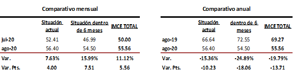 En comparación con agosto de 2019, el IMCE cayó –19.79% para acumular un total de diecisiete meses a la baja, sin embargo, el tropiezo fue el menor de los últimos seis meses. Esto fue resultado, de una disminución anual de –15.36% en la Situación Actual y de –24.89% en la Situación Futura.