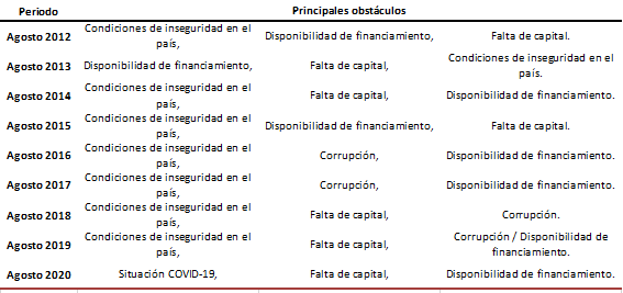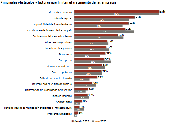 En agosto, la Situación COVID-19 fue elegida como el principal factor que limita el crecimiento de las empresas, seguido por la falta de capital y la disponibilidad de financiamiento, en tanto que las condiciones de inseguridad cayeron al cuarto lugar.