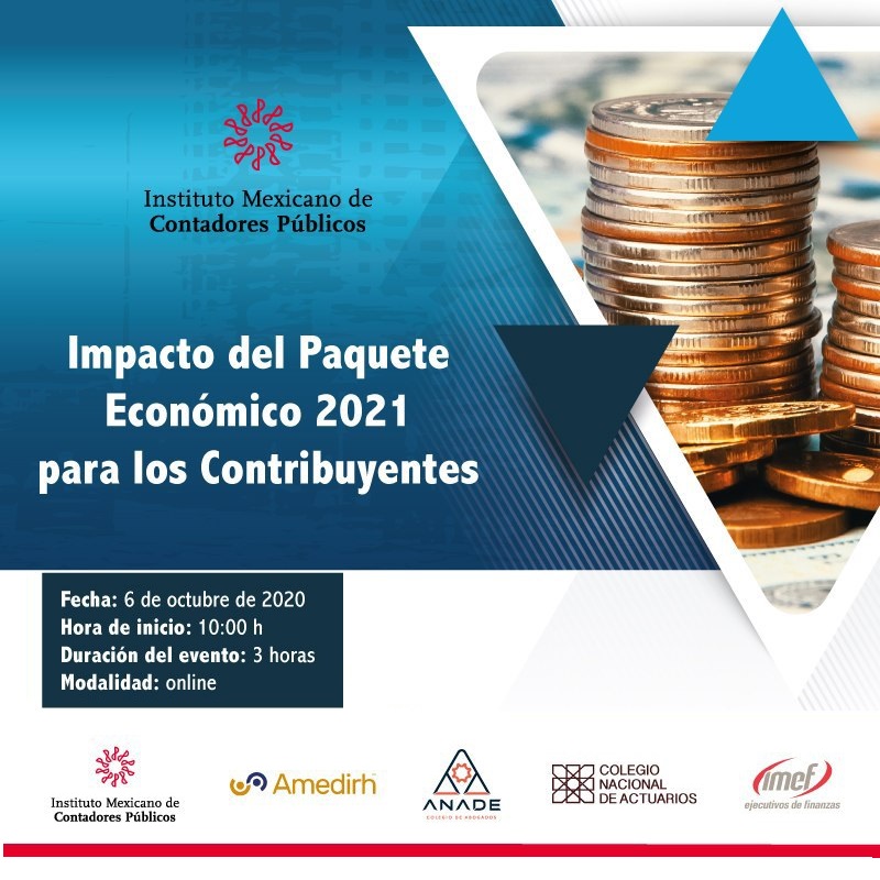 El Comité Ejecutivo Nacional (CEN) del Instituto Mexicano de Contadores Públicos (IMCP), por medio de su Presidente, C.P.C. y Mtra. Diamantina Perales Flores, y del Vicepresidente de Fiscal, C.P. PCFI. Héctor Amaya Estrella, los invitan a participar en el evento virtual denominado IMPACTO DEL PAQUETE ECONÓMICO 2021 PARA LOS CONTRIBUYENTES, organizado de forma conjunta y en alianza entre el IMCP, ANADE, IMEF, AMEDIRH y CONAC.