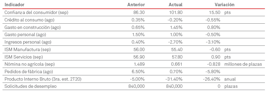 En su reunión del 15 y 16 de septiembre todos los miembros de la Reserva Federal acordaron mantener el rango objetivo para la tasa de fondos federales de 0 a ¼ por ciento. En su discusión sobre la política monetaria observaron que, en general, las condiciones financieras habían mejorado en los últimos meses en parte reflejando medidas de política para apoyar la economía y el flujo de crédito a los hogares y empresas. Los miembros acordaron que la Reserva Federal estaba comprometida a utilizar su gama completa de herramientas para apoyar a la economía en este momento desafiante, promoviendo así sus metas de máximo empleo y estabilidad de precios. En general, los miembros esperaban que sería apropiado mantener una postura acomodaticia de la política monetaria hasta que se lograran estos resultados. Los miembros también declararon que la trayectoria de la economía dependería significativamente del curso del virus. Además, acordaron que la actual crisis de salud pública continuaría pesando sobre la actividad económica, el empleo y la inflación a corto plazo y forjaba riesgos considerables para las perspectivas económicas a mediano plazo. La mayoría de los participantes planteó la preocupación de que el apoyo fiscal hasta ahora para los hogares, las empresas y los gobiernos estatales y locales podría no proporcionar suficiente alivio a estos sectores. El déficit comercial aumentó en agosto a un máximo de 14 años y las importaciones volvieron a subir, lo que sugiere que el comercio podría ser un lastre para el crecimiento económico en el tercer trimestre. El Departamento de Comercio informó que el déficit comercial aumentó a $USD 67,100 millones, el mayor desde agosto de 2006. Las importaciones aumentaron 3.2% a $USD 239 mil millones y las exportaciones aumentaron 2.2% a $USD 171.9 mil millones.