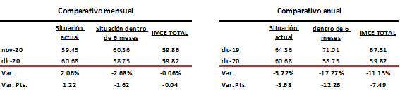 El IMCE de diciembre de 2020 mostró una suave reducción de –0.06% para colocarse en 59.82 unidades con 0.04 puntos menos respecto a noviembre. Al interior, la Situación Actual continuó avanzando para pasar de 59.45 puntos a 60.68 puntos, la mejor puntuación observada en los últimos diez meses, dando lugar a un crecimiento mensual de 2.06%. En cambio, la Situación Futura, que corresponde a los próximos seis meses, cayó -2.68% a 58.75 unidades.