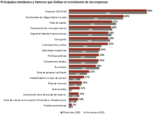 Dentro de los elementos que limitan el crecimiento, la Situación COVID-19 fue seleccionada nuevamente como el principal factor al que se enfrentan las empresas, en segundo lugar, se ubicaron las Condiciones de Inseguridad en el País, seguida por la Falta de Capital.