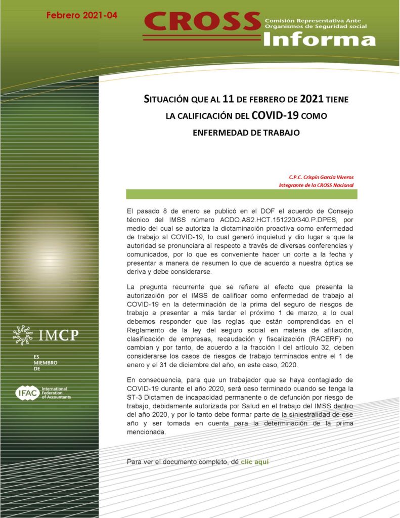 El pasado 8 de enero se publicó en el DOF el acuerdo de Consejo técnico del IMSS número ACDO.AS2.HCT.151220/340.P.DPES, por medio del cual se autoriza la dictaminación proactiva como enfermedad de trabajo al COVID-19, lo cual generó inquietud y dio lugar a que la autoridad se pronunciara al respecto a través de diversas conferencias y comunicados, por lo que es conveniente hacer un corte a la fecha y presentar a manera de resumen lo que de acuerdo a nuestra óptica se deriva y debe considerarse.