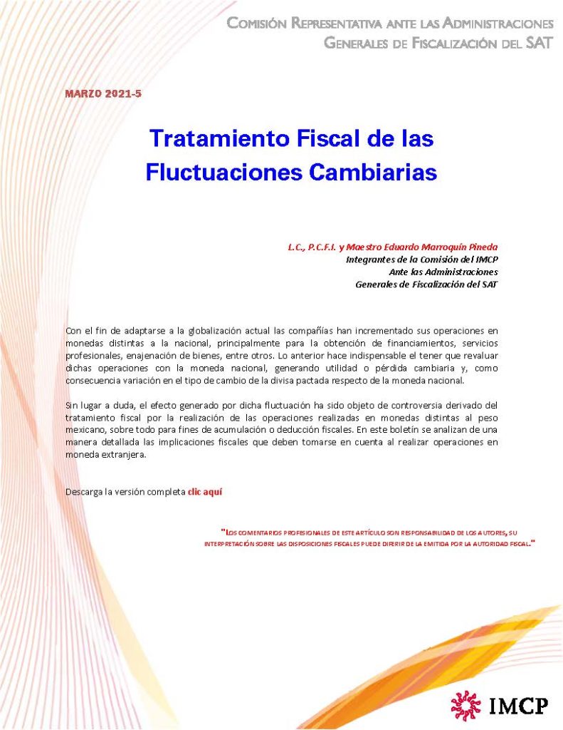 Sin lugar a duda, el efecto generado por dicha fluctuación ha sido objeto de controversia derivado del tratamiento fiscal por la realización de las operaciones realizadas en monedas distintas al peso mexicano, sobre todo para fines de acumulación o deducción fiscales. En este boletín se analizan de una manera detallada las implicaciones fiscales que deben tomarse en cuenta al realizar operaciones en moneda extranjera.