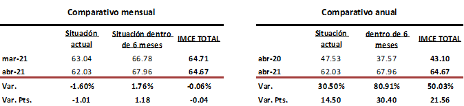 El IMCE del cuarto mes de 2021, retrocedió suavemente –0.06% para situarse en 64.67 puntos, disminuyendo –0.04 puntos en relación con marzo. Esto fue resultado en gran parte por un declive de –1.60% en la Situación Actual, que disminuyó de 63.04 puntos a 62.03 unidades. En contraste, la Situación Futura, que corresponde a los próximos seis meses, tocó un máximo de 15 meses, al elevarse 1.76% en el mes en cuestión, para colocarse en 67.96 puntos con 1.18 unidades más.