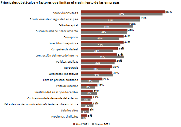 En el mes de abril, la Situación COVID-19 fue elegida como el obstáculo central al que se enfrenta la economía mexicana, en segundo lugar, se ubicaron las Condiciones de Inseguridad en el País y en el tercer peldaño, la Falta de Capital. Cabe señalar, que subieron al quinto lugar tanto la Corrupción como la Incertidumbre Jurídica, desplazando la Contracción del Mercado Interno.