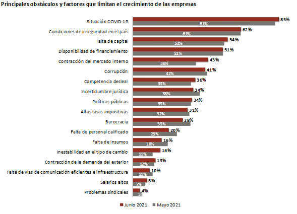 La Situación COVID-19 volvió a ser elegida como la principal limitante al que se enfrenta la economía, seguido por las Condiciones de Inseguridad en el País y la Falta de Capital. Cabe señalar, que la Incertidumbre Jurídica cayó al octavo lugar desde el sexto, mientras que la Contracción del Mercado Interno se elevó al quinto peldaño desde el séptimo.