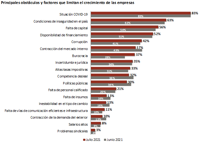 De acuerdo con la encuesta mensual, la Situación COVID-19 siguió siendo seleccionada como el principal obstáculo al que se enfrenta la economía mexicana, en segundo lugar, se eligieron las Condiciones de Inseguridad en el País y en tercero, la Falta de Capital; destacando que la Corrupción volvió a ubicarse dentro de las cinco principales limitantes.