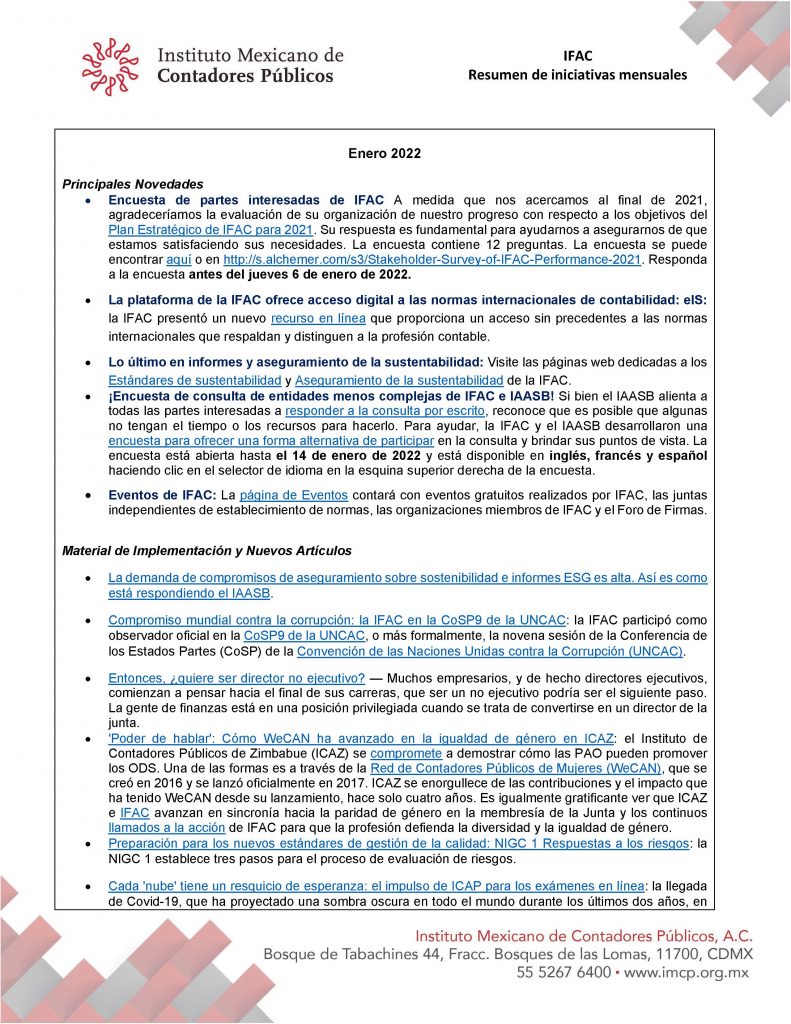 IFAC. Resumen de iniciativas mensuales. Enero 2022.