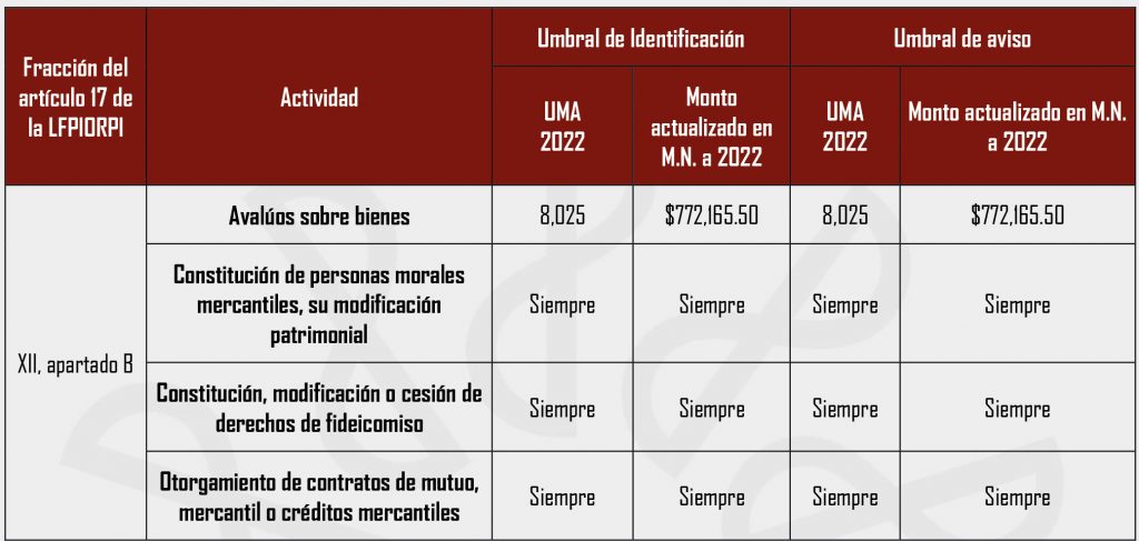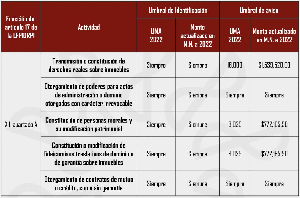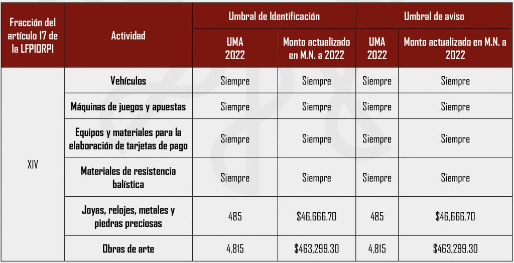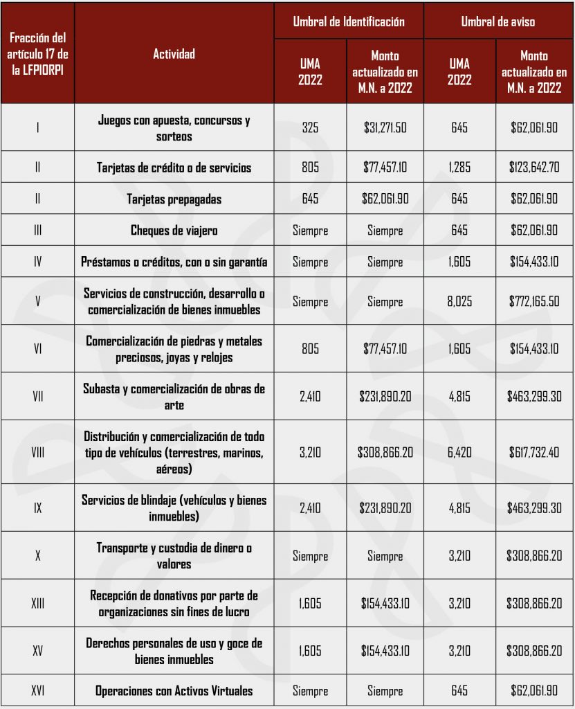 A. Umbrales de identificación y de aviso para las actividades vulnerables contenidas en el artículo 17 de la LFPIORPI