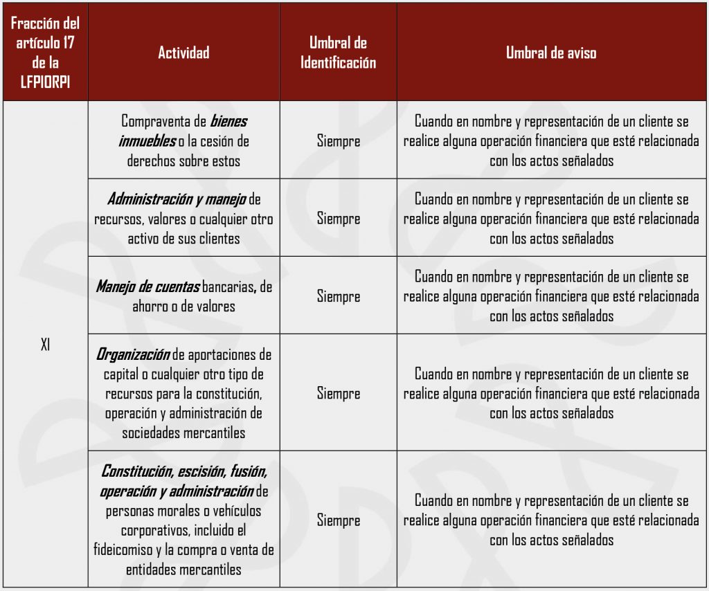 Umbral de identificación. Es el importe que la ley establece para que los sujetos obligados cumplan con las demás obligaciones contenidas en la LFPIORPI. Realizar actividades por importes menores a este umbral NO genera obligación alguna en la LEFPIORPI.