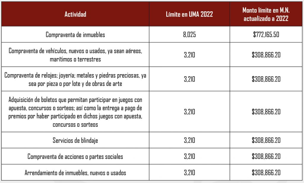 No obstante que en la Ley Federal para la Prevención de Operaciones con Recursos de Procedencia Ilícita (LFPIORPI) no se hace referencia a la UMA sino a “salarios mínimos” para establecer los umbrales de identificación, avisos, sanciones, prohibiciones y demás obligaciones, el valor de la UMA es de aplicación obligatoria conforme a lo establecido en el artículo Tercero Transitorio del Decreto por el que se declaran reformadas y adicionadas diversas disposiciones de la Constitución Política de los Estados Unidos Mexicanos (CPEUM) en materia de desindexación del salario mínimo, publicado en el DOF del 27 de enero de 2016.