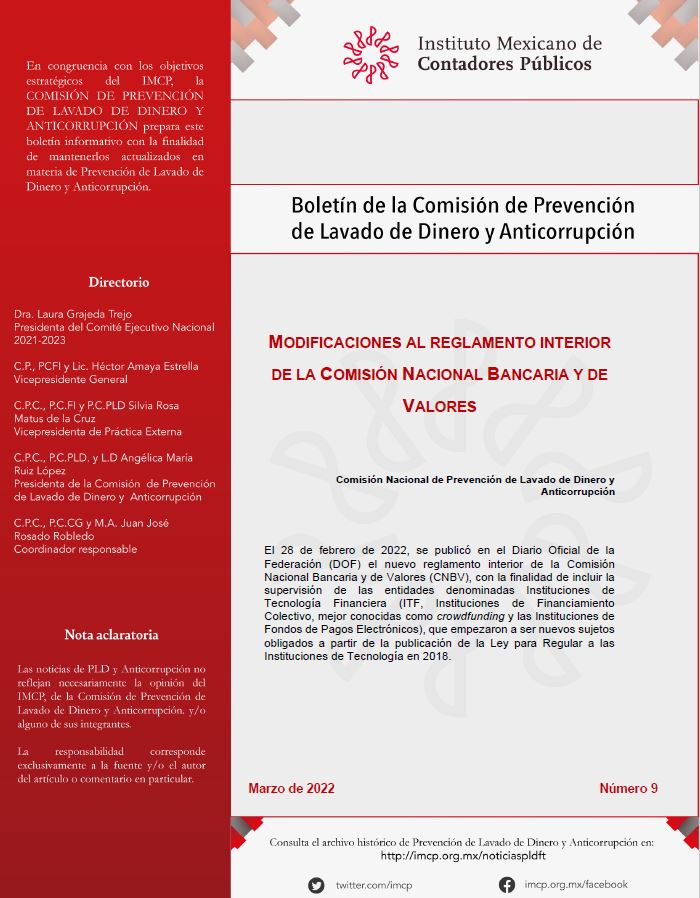 El 28 de febrero de 2022, se publicó en el Diario Oficial de la Federación (DOF) el nuevo reglamento interior de la Comisión Nacional Bancaria y de Valores (CNBV), con la finalidad de incluir la supervisión de las entidades denominadas Instituciones de Tecnología Financiera (ITF, Instituciones de Financiamiento Colectivo, mejor conocidas como crowdfunding y las Instituciones de Fondos de Pagos Electrónicos), que empezaron a ser nuevos sujetos obligados a partir de la publicación de la Ley para Regular a las Instituciones de Tecnología en 2018.