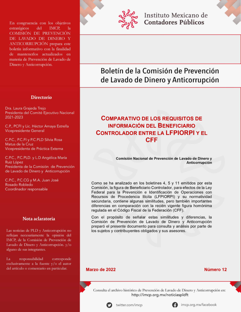 Como se ha analizado en los boletines 4, 5 y 11 emitidos por esta Comisión, la figura de Beneficiario Controlador, para efectos de la Ley Federal para la Prevención e Identificación de Operaciones con Recursos de Procedencia Ilícita (LFPIORPI) y su normatividad secundaria, contiene algunas similitudes, pero también importantes diferencias en comparación con la recién vigente figura homónima regulada en el Código Fiscal de la Federación (CFF).