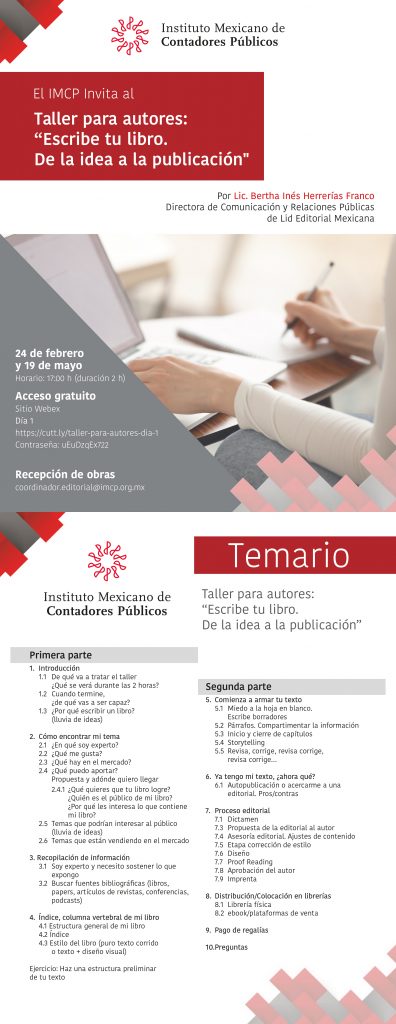 El Instituto Mexicano de Contadores Públicos, A.C., invita cordialmente al taller para autores “Escribe tu libro. De la idea a la publicación”, donde contaremos con la intervención de la Lic. Bertha Inés Herrerías Franco, Directora de Comunicación y Relaciones Públicas de Lid Editorial Mexicana.