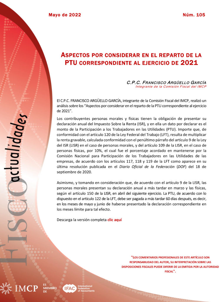 El C.P.C. FRANCISCO ARGÜELLO GARCÍA, integrante de la Comisión Fiscal del IMCP, realizó un análisis sobre los “Aspectos por considerar en el reparto de la PTU correspondiente al ejercicio de 2021”.