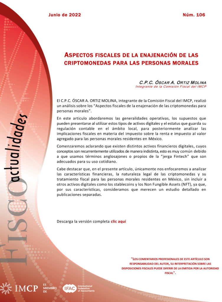 El C.P.C. ÓSCAR A. ORTIZ MOLINA, integrante de la Comisión Fiscal del IMCP, realizó un análisis sobre los “Aspectos fiscales de la enajenación de las criptomonedas para personas morales”.