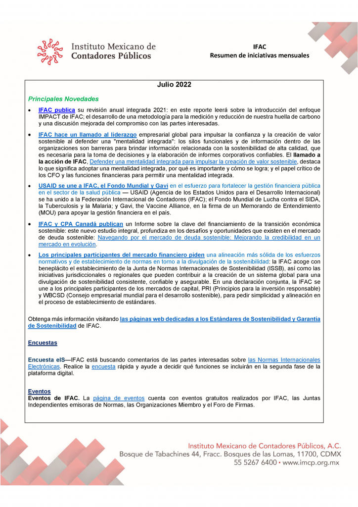 IFAC. Resumen de iniciativas mensuales. Julio 2022