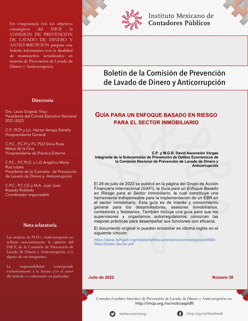 El 26 de julio de 2022 se publicó en la página del Grupo de Acción Financiera Internacional (GAFI), la Guía para un Enfoque Basado en Riesgo para el Sector Inmobiliario, la cual constituye una herramienta indispensable para la implementación de un EBR en el sector inmobiliario. Esta guía es de interés y conocimiento general para los desarrolladores, asesores inmobiliarios, contadores y fedatarios. También incluye una guía para que los supervisores y organismos autorregulatorios conozcan las mejores prácticas para desempeñar sus funciones con eficacia.