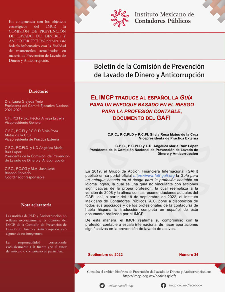 En 2019, el Grupo de Acción Financiera Internacional (GAFI) publicó en su portal oficial https://www.fatf-gafi.org la Guía para un enfoque basado en el riesgo para la profesión contable en idioma inglés, la cual es una guía no vinculante con acciones significativas de la propia profesión, la cual reemplaza a la versión de 2008 y la alinea con las recomendaciones actuales del GAFI; así, a partir del 19 de septiembre de 2022, el Instituto Mexicano de Contadores Públicos, A.C. pone a disposición de todos sus asociados y de los profesionales de la contaduría de habla hispana la traducción completa en español de este documento realizada por el IMCP.