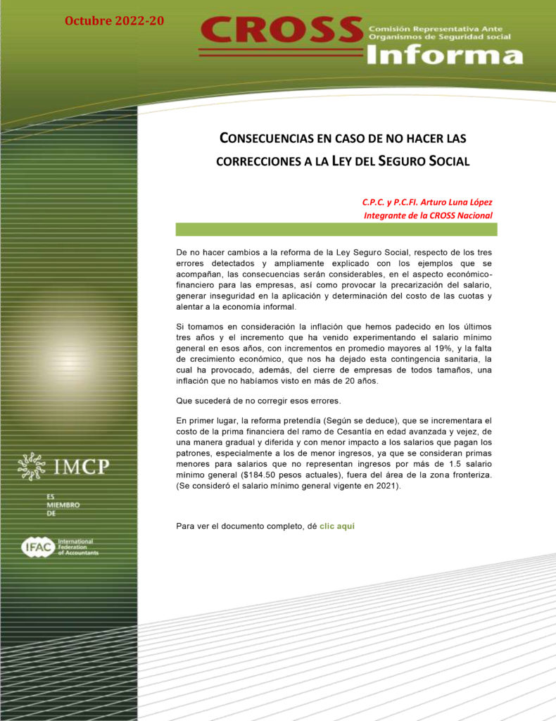 Boletín de Noticias de la CROSS 2022-20 CONSECUENCIAS EN CASO DE NO HACER LAS CORRECCIONES A LA LEY DEL SEGURO SOCIAL