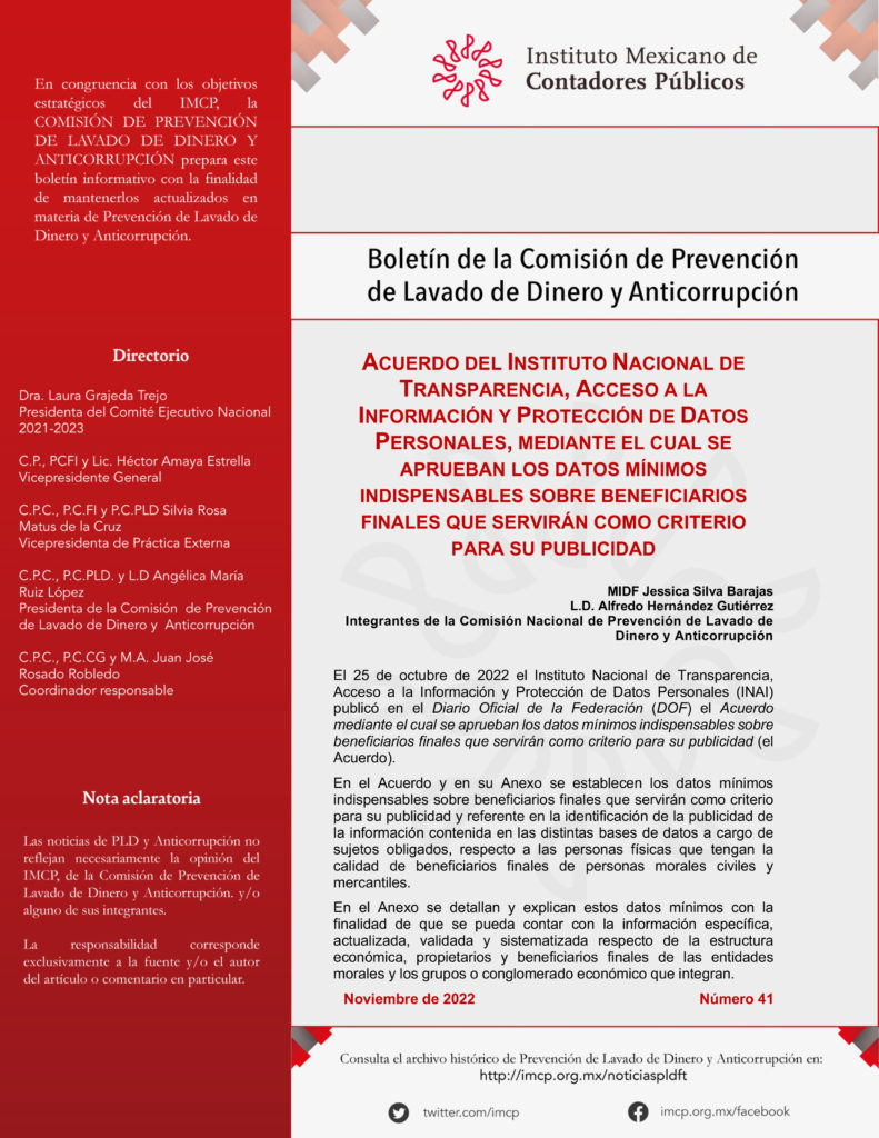 El 25 de octubre de 2022 el Instituto Nacional de Transparencia, Acceso a la Información y Protección de Datos Personales (INAI) publicó en el Diario Oficial de la Federación (DOF) el Acuerdo mediante el cual se aprueban los datos mínimos indispensables sobre beneficiarios finales que servirán como criterio para su publicidad (el Acuerdo).