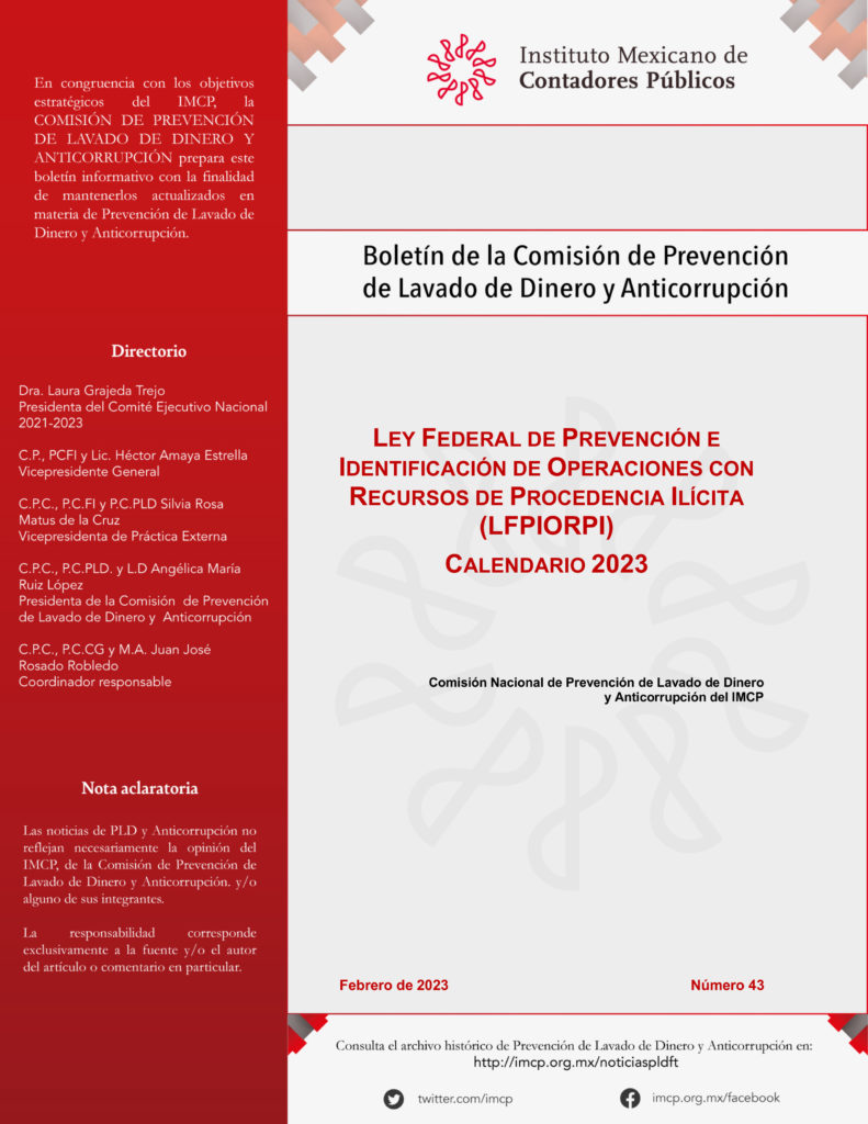 La Comisión de Prevención de Lavado de Dinero y Anticorrupción llevó a cabo la elaboración del siguiente boletín, para que los asociados del IMCP y las personas que asesoren en esta materia cuenten con la información para llevar a cabo una adecuada asesoría a sus clientes en cumplimiento de la Ley Federal de Prevención e Identificación de Operaciones con Recursos de Procedencia Ilícita (LFPIORPI), su Reglamento, sus Reglas de Carácter General y los criterios aplicables.
