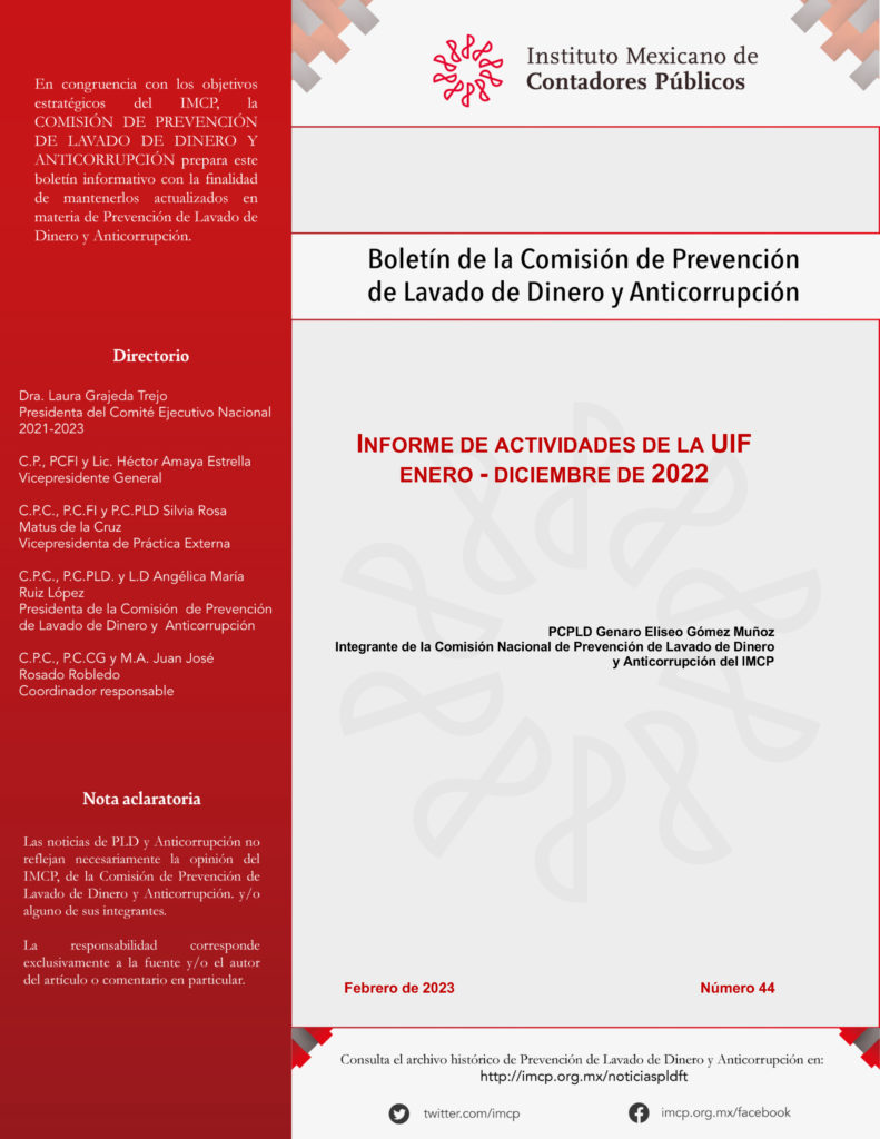 La Unidad de Inteligencia Financiera (UIF) de México, puso a disposición del público en su página de internet el informe de actividades por el periodo enero-diciembre de 2022.