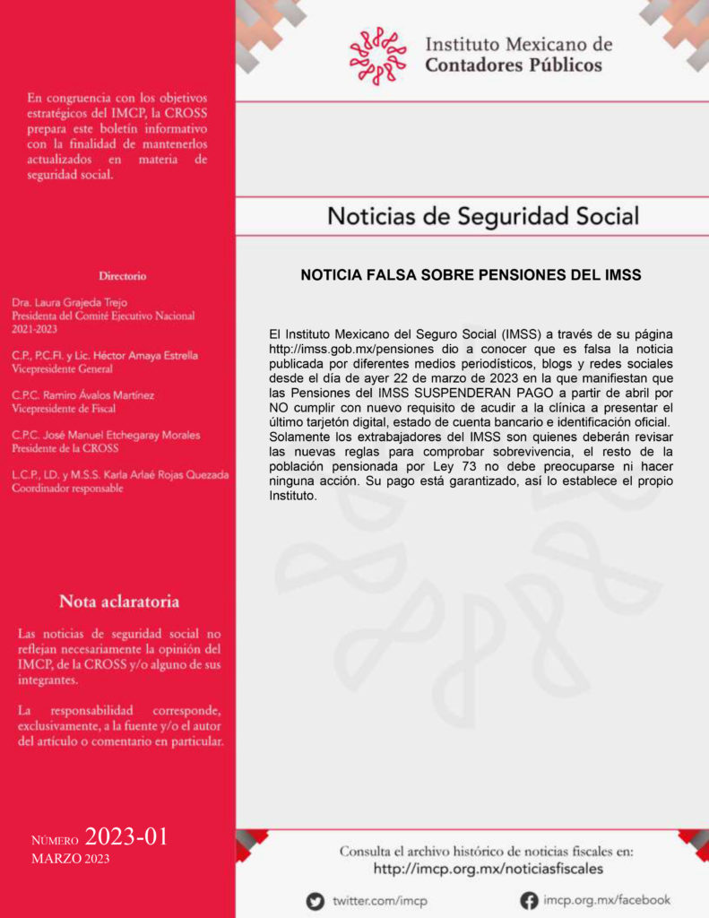 El Instituto Mexicano del Seguro Social (IMSS) a través de su página http://imss.gob.mx/pensiones dio a conocer que es falsa la noticia publicada por diferentes medios periodísticos, blogs y redes sociales desde el día de ayer 22 de marzo de 2023 en la que manifiestan que las Pensiones del IMSS SUSPENDERAN PAGO a partir de abril por NO cumplir con nuevo requisito de acudir a la clínica a presentar el último tarjetón digital, estado de cuenta bancario e identificación oficial.