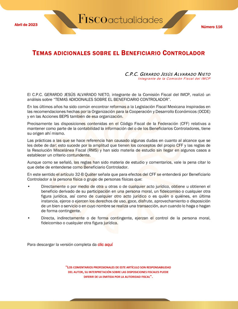 El C.P.C. GERARDO JESÚS ALVARADO NIETO, integrante de la Comisión Fiscal del IMCP, realizó un análisis sobre “TEMAS ADICIONALES SOBRE EL BENEFICIARIO CONTROLADOR”.