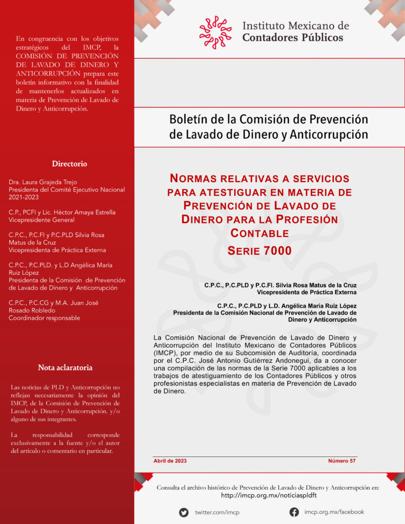 La Comisión Nacional de Prevención de Lavado de Dinero y Anticorrupción del Instituto Mexicano de Contadores Públicos (IMCP), por medio de su Subcomisión de Auditoría, coordinada por el C.P.C. José Antonio Gutiérrez Andonegui, da a conocer una compilación de las normas de la Serie 7000 aplicables a los trabajos de atestiguamiento de los Contadores Públicos y otros profesionistas especialistas en materia de Prevención de Lavado de Dinero.