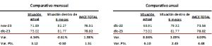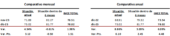 El IMCE de diciembre de 2023 continuó elevándose, aunque a un menor ritmo, al subir a una tasa mensual de 1.98%, alcanzado un puntaje de 78.02, por lo que se ubicó ligeramente por detrás de las 78.27 unidades registradas en junio de 2023. Lo anterior es atribuido a un incremento mensual de 4.34% en la Situación Actual, ya que la Situación Futura, la cual representa la confianza en los próximos seis meses, se enfrió -0.61% en el mes. Por consecuente, el componente actual se situó en 75.02 puntos y el componente futuro se colocó en 81.77 unidades.