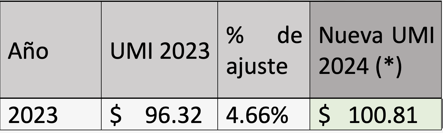 Mediante comunicado del 11 de enero de 2024 el INFONAVIT confirma que los créditos con estas características se ajustarán con el mismo porcentaje de la UMA (4.66%). Lo anterior, nos da un valor de UMI para 2024 de $ 100.81: