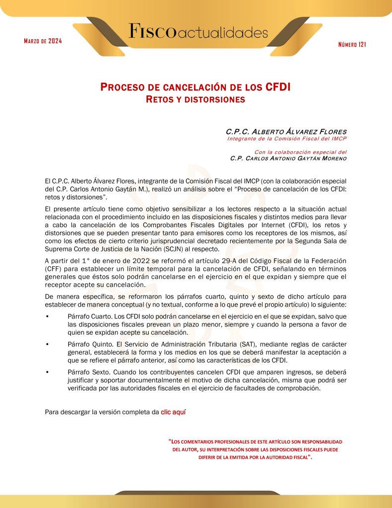El C.P.C. Alberto Álvarez Flores, integrante de la Comisión Fiscal del IMCP (con la colaboración especial del C.P. Carlos Antonio Gaytán M.), realizó un análisis sobre el “Proceso de cancelación de los CFDI: retos y distorsiones”.