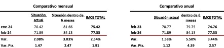 El IMCE de febrero de 2024 registro un crecimiento mensual de 2.54%, para tocar los 77.33 puntos con 1.91 puntos más que enero.