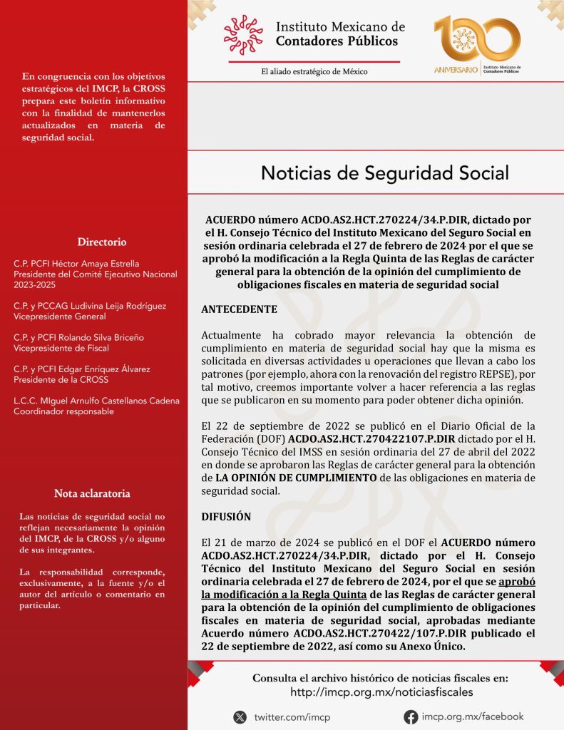 El 21 de marzo de 2024 se publicó en el DOF el ACUERDO número ACDO.AS2.HCT.270224/34.P.DIR, dictado por el H. Consejo Técnico del Instituto Mexicano del Seguro Social en sesión ordinaria celebrada el 27 de febrero de 2024, por el que se aprobó la modificación a la Regla Quinta de las Reglas de carácter general para la obtención de la opinión del cumplimiento de obligaciones fiscales en materia de seguridad social, aprobadas mediante Acuerdo número ACDO.AS2.HCT.270422/107.P.DIR publicado el 22 de septiembre de 2022, así como su Anexo Único.
