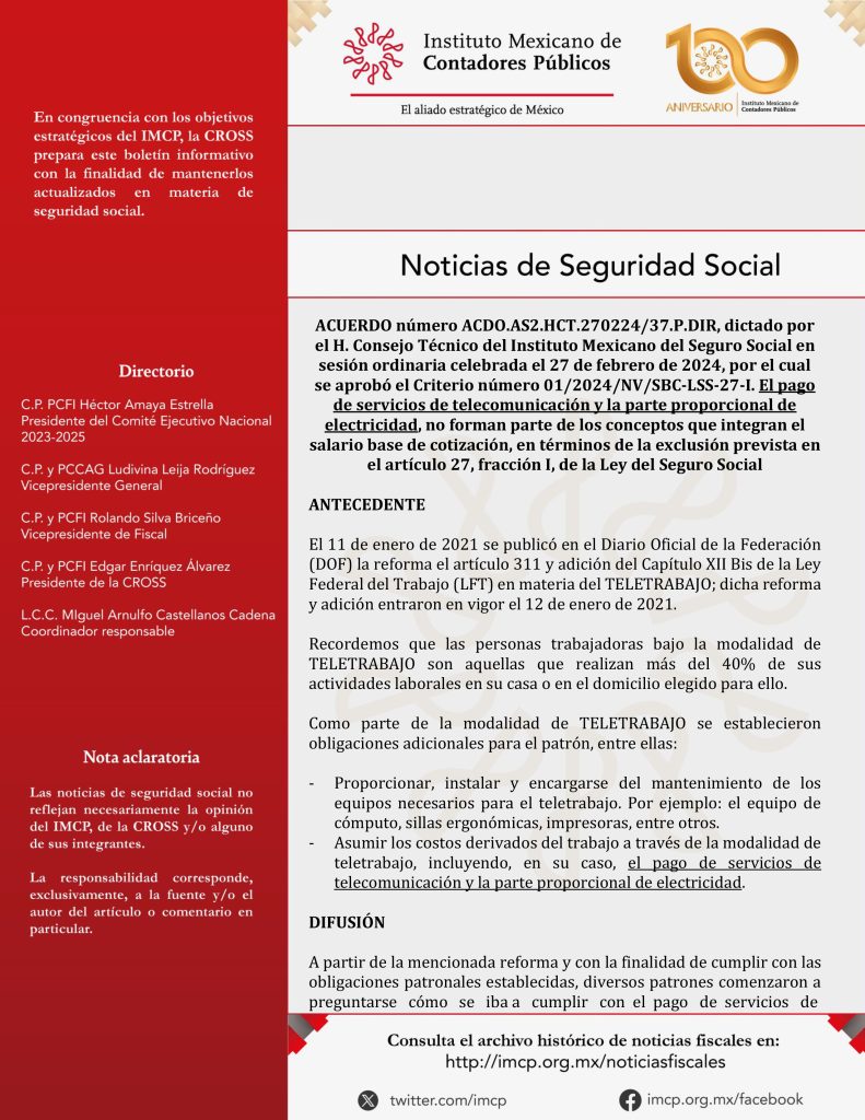 A partir de la mencionada reforma y con la finalidad de cumplir con las obligaciones patronales establecidas, diversos patrones comenzaron a preguntarse cómo se iba a cumplir con el pago de servicios de telecomunicación y la parte proporcional de luz, lo cual para efectos de determinar el Salario Base de Cotización (SBC) y pago de las cuotas obrero patronales estaba sin un criterio establecido de manera generalizada desde la fecha de la reforma hasta el 21 de febrero porque, el 22 de marzo de 2024 se publicó en el DOF el ACUERDO número ACDO.AS2.HCT.270224/37.P.DIR, dictado por el H. Consejo Técnico del Instituto Mexicano del Seguro Social en sesión ordinaria celebrada el 27 de febrero de 2024, por el cual se aprobó el Criterio número 01/2024/NV/SBC-LSS-27-I, a efecto de precisar que las prestaciones en materia de teletrabajo derivadas de obligaciones patronales de proporcionar, instalar y encargarse del mantenimiento de los equipos necesarios para el teletrabajo, así como de asumir los costos derivados de la citada modalidad de trabajo especial -incluyendo, en su caso, el pago de servicios de telecomunicación y la parte proporcional de electricidad-, no forman parte de los conceptos que integran el salario base de cotización, en términos de la exclusión prevista en el artículo 27, fracción I, de la Ley del Seguro Social, así como su Anexo Único.