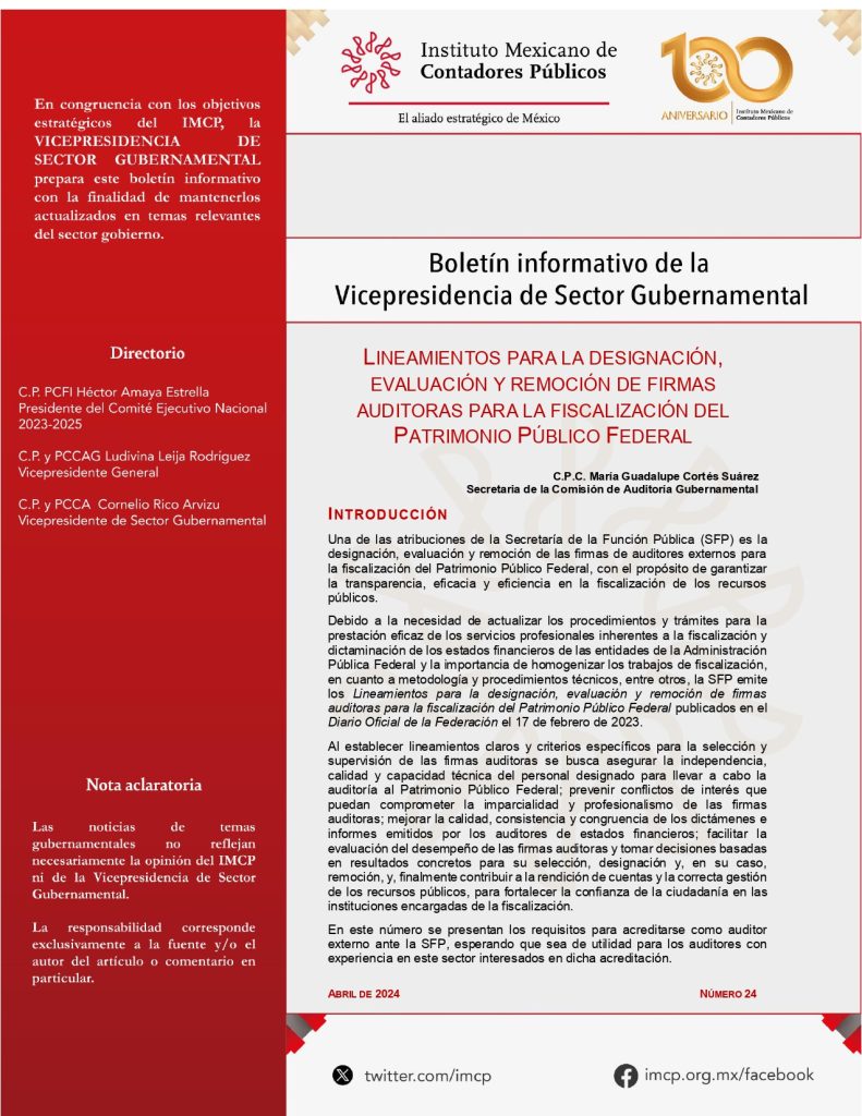 En este número se presentan los requisitos para acreditarse como auditor externo ante la SFP, esperando que sea de utilidad para los auditores con experiencia en este sector interesados en dicha acreditación.
