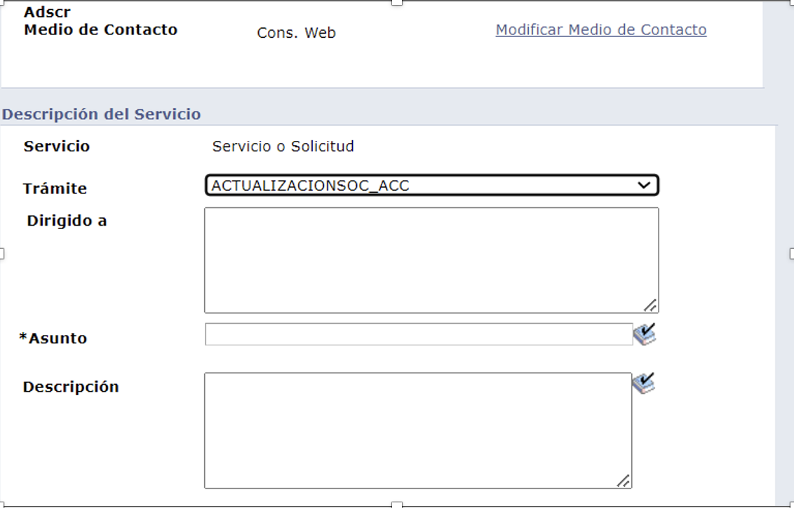 Al día de hoy, dentro de la aplicación “Mi portal”, menú “solicitudes”, submenú listado para selección de etiquetas, se encuentra disponible, la etiqueta de trámite ACTUALIZACIONSOC_ACC, para la presentación de información correcta para el aviso de actualización de socios y accionistas.