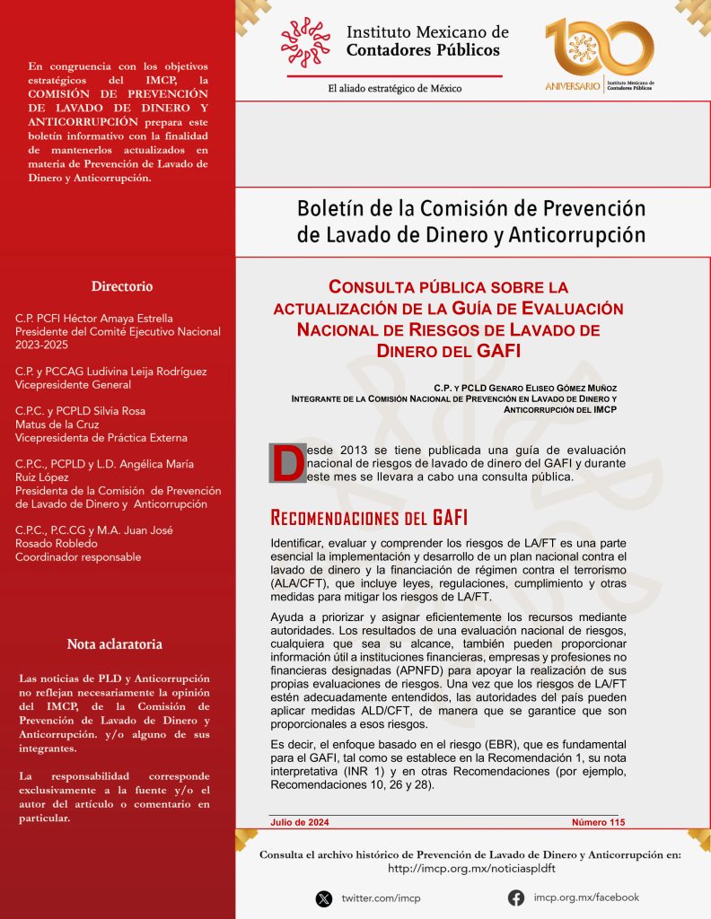 Desde 2013 se tiene publicada una guía de evaluación nacional de riesgos de lavado de dinero del GAFI y durante este mes se llevara a cabo una consulta pública.