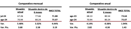 Con respecto a agosto de 2023, el IMCE mejoró un 1.94% en términos anuales, impulsado por un avance del 4.14% en la Situación Actual, en tanto que la Situación Futura sufrió una disminución de -0.38%.