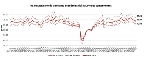 El IMCE de agosto de 2024 se recuperó, al presentar una tasa mensual de 4.44%, por lo que incrementó 3.19 puntos a 75.07 puntos. El avance mensual se debió principalmente a una mejoría en la Situación Actual, la cual anotó una tasa de 5.48% en el mes de agosto, para situarse en 70.94 con 3.68 puntos más que julio. La Situación Futura, que representa la confianza en los próximos seis meses, se elevó en menor proporción, al arrojar un crecimiento de 3.32%, para situarse en 80.24 puntos desde los 77.66 puntos del mes previo.