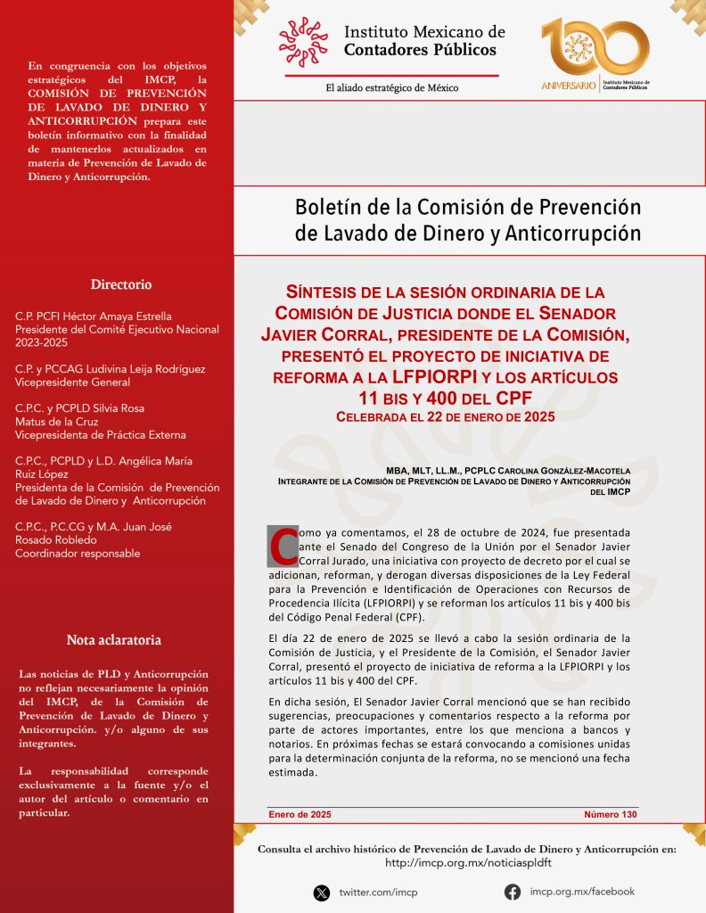 El día 22 de enero de 2025 se llevó a cabo la sesión ordinaria de la Comisión de Justicia, y el Presidente de la Comisión, el Senador Javier Corral, presentó el proyecto de iniciativa de reforma a la LFPIORPI y los artículos 11 bis y 400 del CPF.