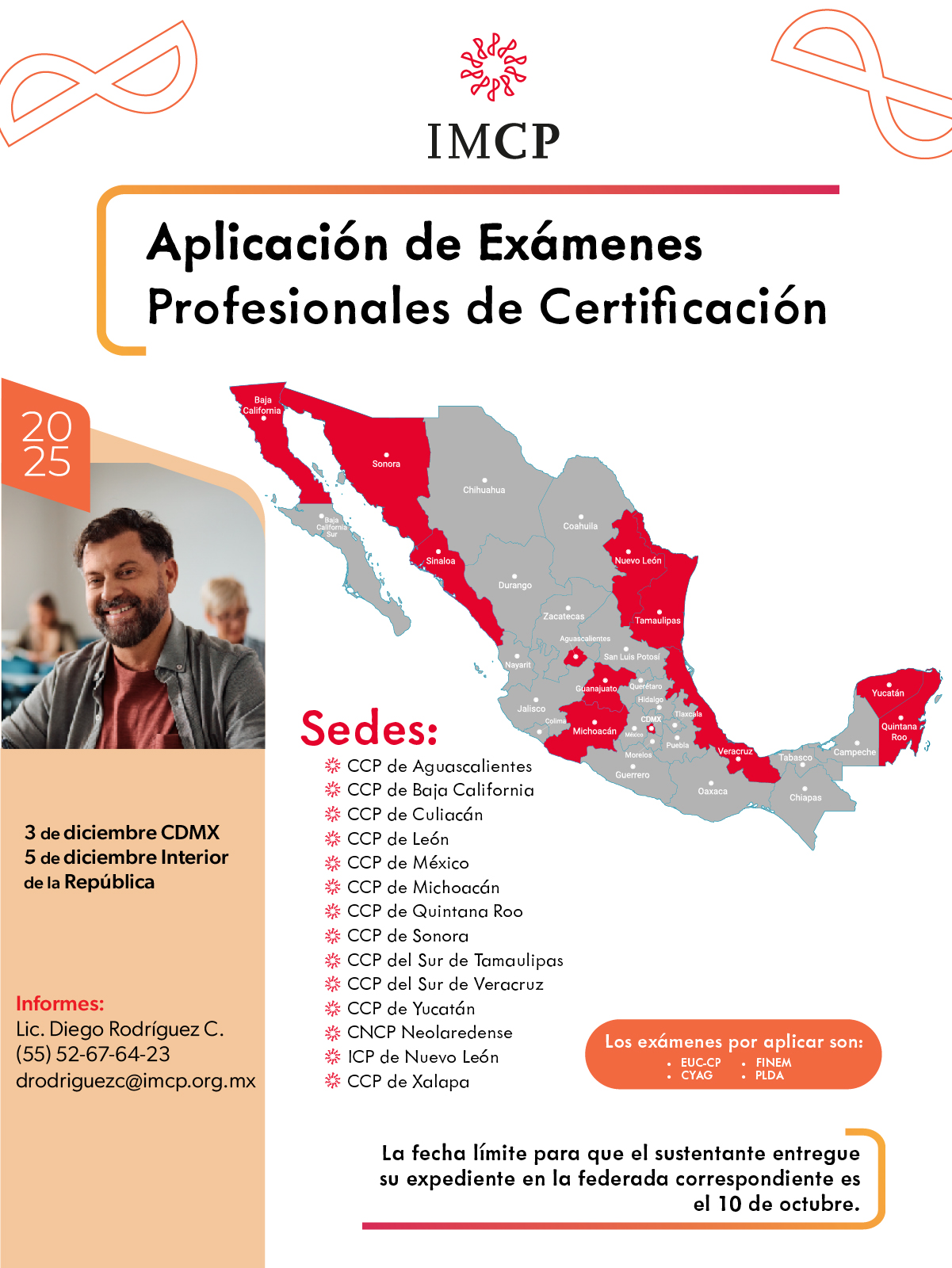 Si va a presentar su Examen de Certificación próximamente, ingrese aquí para que pueda descargar los formatos que necesitará para su documentación. Además, podrá conocer la nueva herramienta del IMCP que le ayudará a prepararse mejor para ese importante evento, con la ayuda a distancia a través del Diplomado de Certificación.