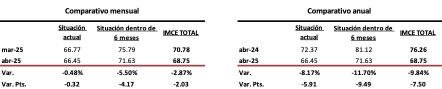 En comparación con el mismo mes de 2024, el IMCE sufrió un retroceso anual de -9.84%, debido a una contracción de -8.17% en la Situación Actual y de -11.70% en la Situación Futura.