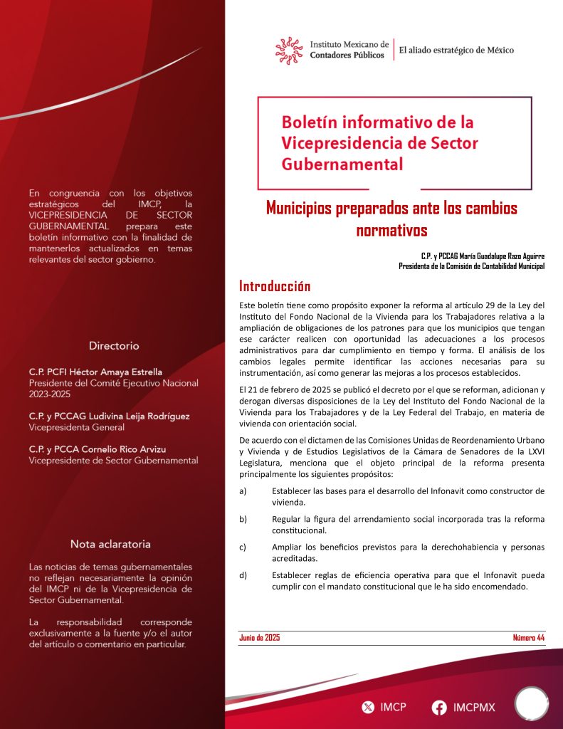 Este boletín tiene como propósito exponer la reforma al artículo 29 de la Ley del Instituto del Fondo Nacional de la Vivienda para los Trabajadores relativa a la ampliación de obligaciones de los patrones para que los municipios que tengan ese carácter realicen con oportunidad las adecuaciones a los procesos administrativos para dar cumplimiento en tiempo y forma. El análisis de los cambios legales permite identificar las acciones necesarias para su instrumentación, así como generar las mejoras a los procesos establecidos.