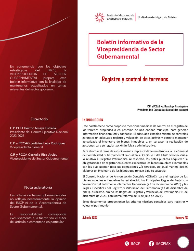 Este boletín tiene como propósito mencionar medidas de control en el registro de los terrenos propiedad o en posesión de una entidad municipal para generar información financiera útil y confiable. El adecuado establecimiento de controles garantiza un adecuado registro y valuación de estos activos y permite mantener actualizado el inventario de bienes inmuebles y, en su caso, la realización de gestiones para su regularización jurídica y administrativa.