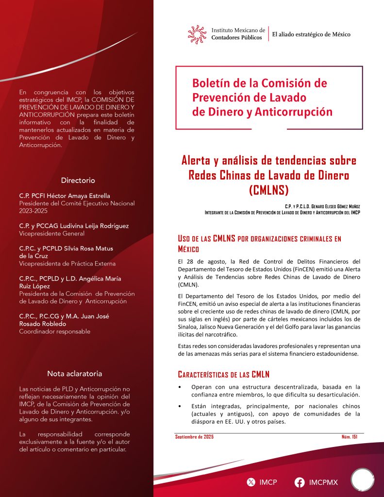 El 28 de agosto, la Red de Control de Delitos Financieros del Departamento del Tesoro de Estados Unidos (FinCEN) emitió una Alerta y Análisis de Tendencias sobre Redes Chinas de Lavado de Dinero (CMLN).